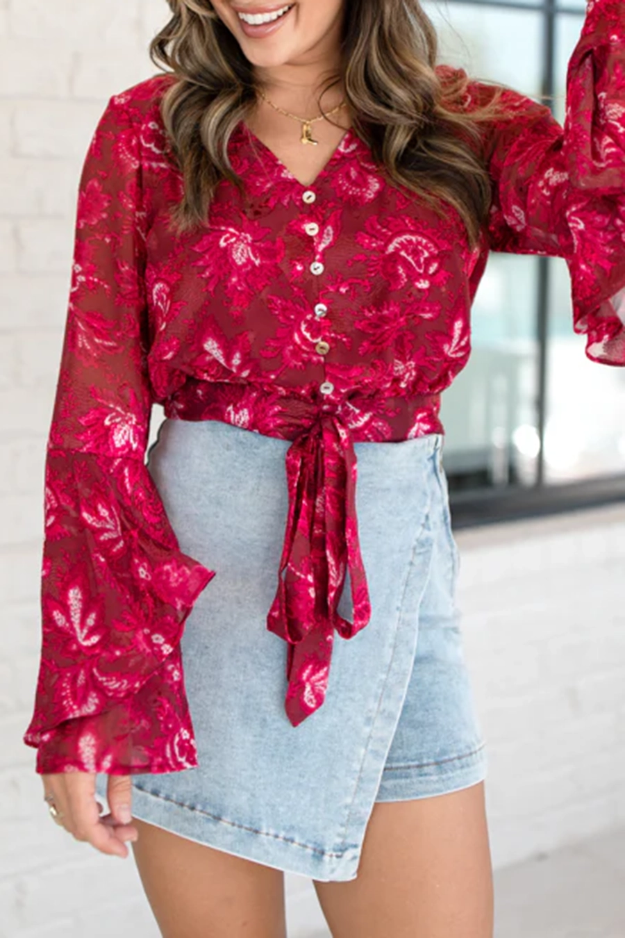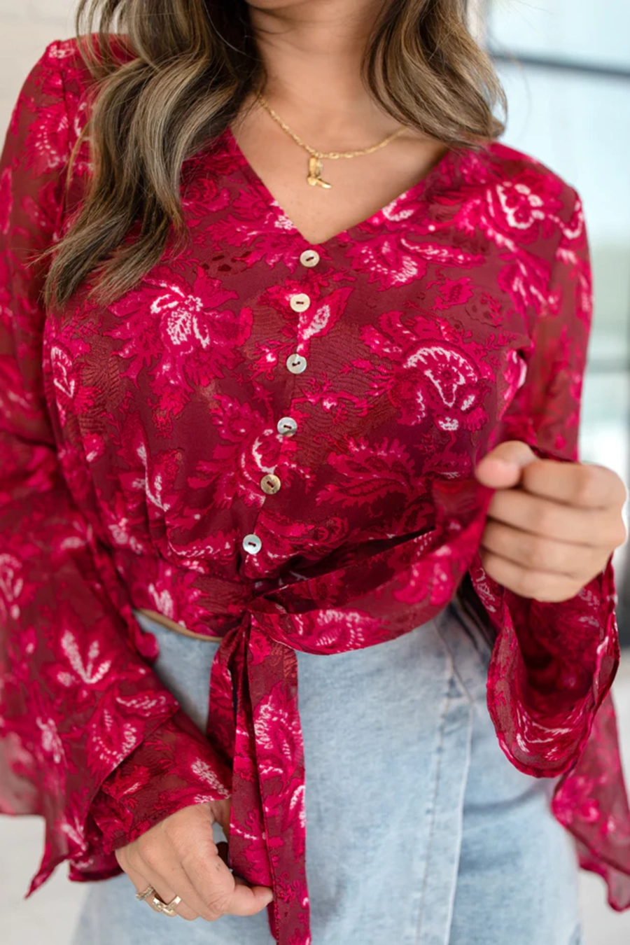 Berry Floral Bell Sleeve Tie Front Blouse 91315
