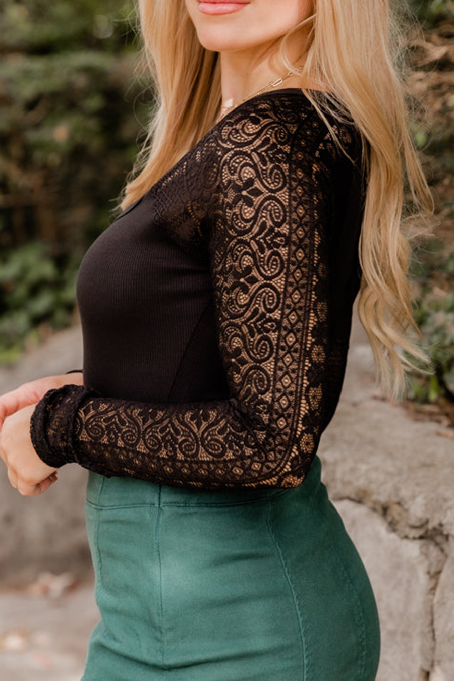 Black Lace Sleeve Square Neck Bodysuit