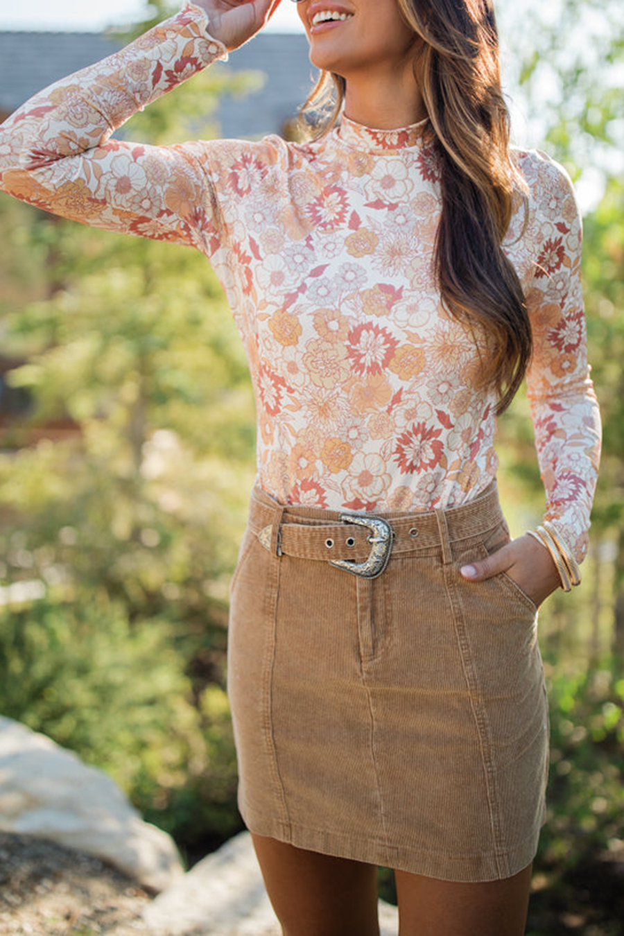 Rust And Mustard Floral Print Mock Neck Bodysuit